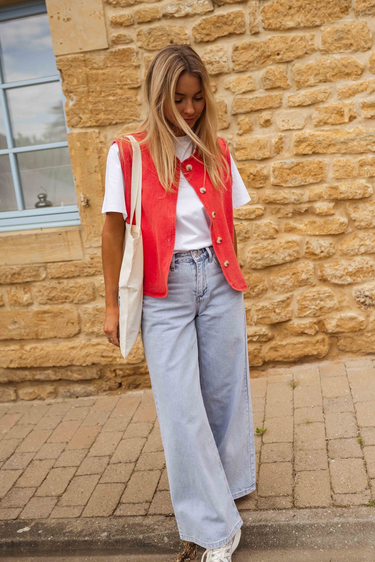 Vintage’owy wygląd i wyrazisty czerwony kolor sprawiają, że kamizelka od razu się wyróżnia. Guziki dodają jej retro uroku idealnie pasuje do miejskich uliczek, kawiarnianych spotkań i letnich koncertów pod gołym niebem.